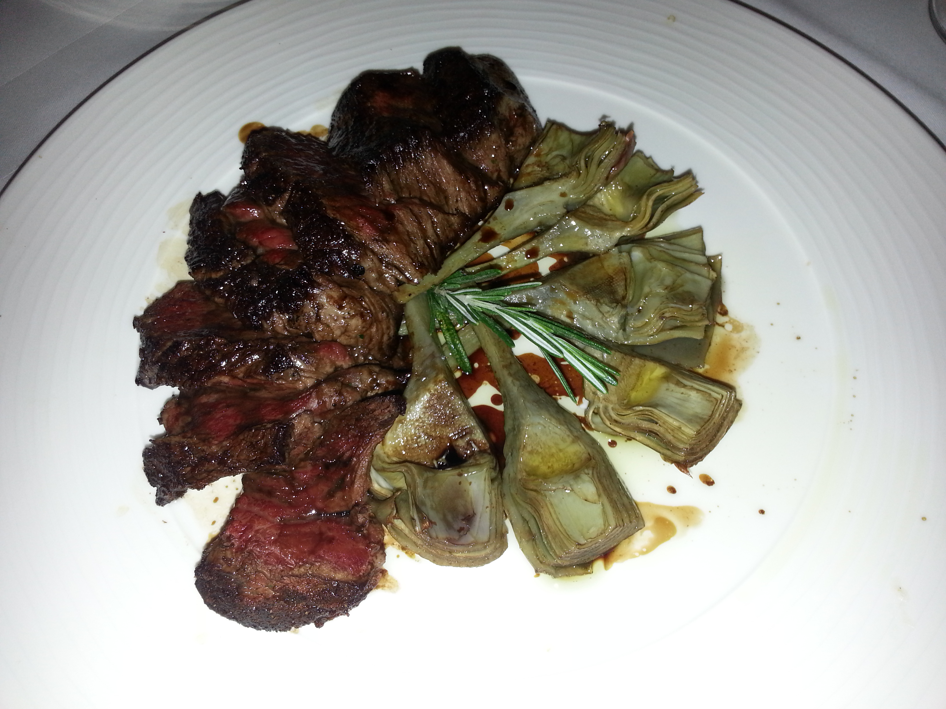 We had salad and mixed starters as first course. The others tried the loup de mer, osso bucco which they liked a lot. I had once more the tagliata – this time interpreted not with rocket salad but with some very delicious artichokes. The meat itself was made to perfection, really worth the price.
